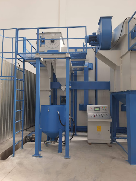 -Oda içerisinde kumlama yapılırken yere düşen çelik bilyanın seperatöre gidebilmesi için zeminin öteleyici kısmı üstü özel tasarlanmış çelik ızgaralar döşenir. Aşağı düşen kum tanecikleri kum haznesinde toplanıp götürücü yardımı ile helezona ordan elevatöre iletilir. Elavatörden separatöre taşınır ve tekrar kullanıma hazır hale gelir Götürücü sistem, özel bir tasarımla yapılmış olup temel kazısını en aza indiren bir dizayndır. Kabin için herhangi bir kazı yapılmayacak olması ve firmamızın özel tasarımları siz değerli müşterilerimize sunulan en büyük avantajlardandır. Sadece, kum taneciklerinin götürücü sistemden seperatöre sadece 130x130x80 cm, elavatör çukuru ve 40x40 cm 'lik bir Helozon çukuru kazılması yeterlidir.